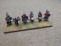 The tartar company (above left) consists of two light cavalry units (Tartar Cav), a Dragoon (I called them Tartar Haiduks for this game), and an elite trotter (Tartar Ulans--aka, nobles). The cossack company consists of two units of clansmen (Zaporazhian axemen), one unit of commanded shot (Platsun), a dragoon (Lysocki Cossacks), and a specialty figure. Each of these companies also included the standard company leader that could be assigned to any unit. We did not play using officer traits/backgrounds nor did we play using the "Double one/Double six" random event table.